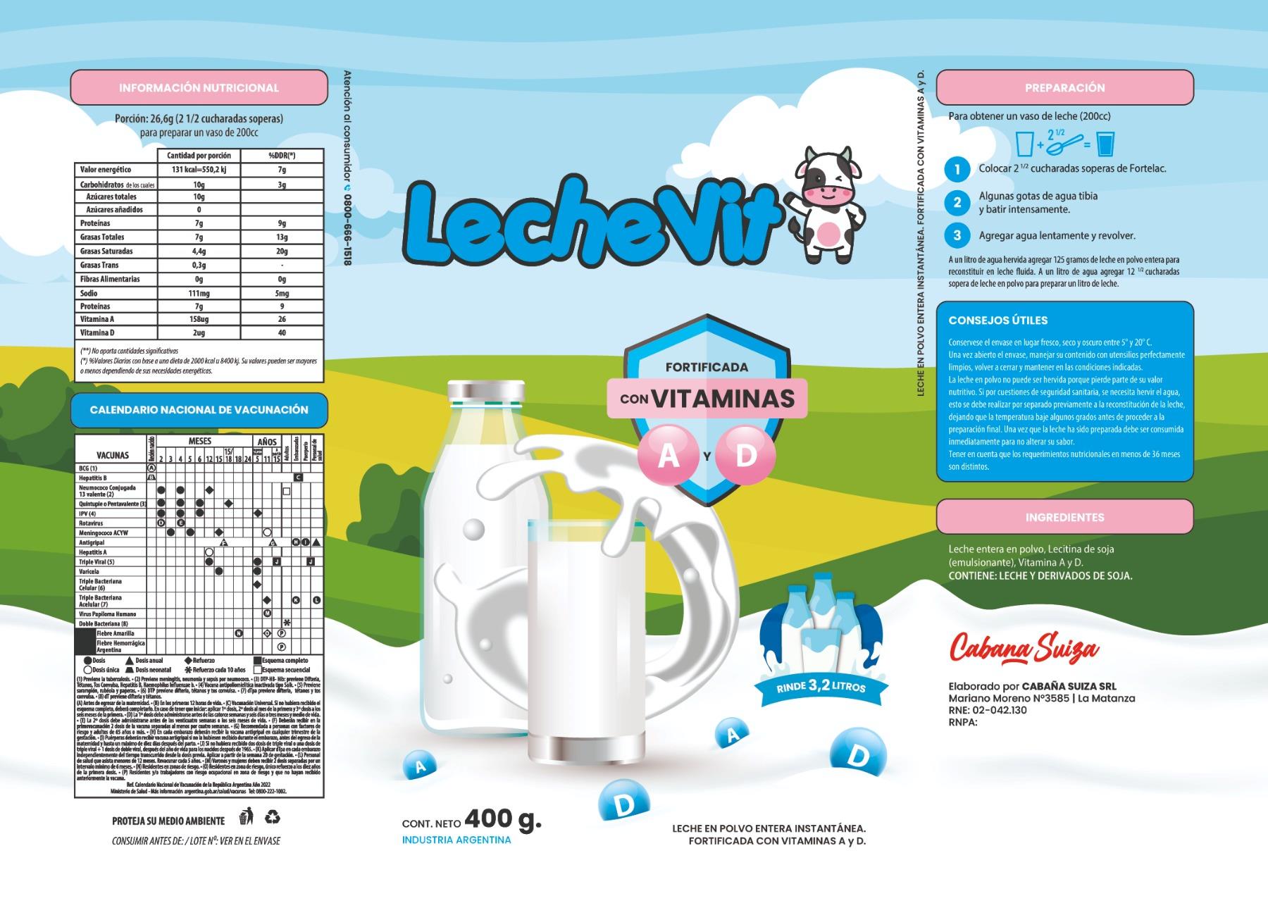 Descripción: LECHE EN POLVO ENTERA INSTANTÁNEA FORTIFICADA CON VITAMINAS A Y D Leche Instantánea Fortificada con Vitaminas A y D LECHEVIT 400,00 GRAMOS (GR)