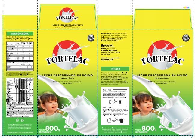 Descripción: LECHE DESCREMADA EN POLVO INSTANTÁNEA FORTIFICADA CON HIERRO, ZINC Y VITAMINA C. LIBRE DE GLUTEN FORTELAC 800,00 GRAMOS (GR)
