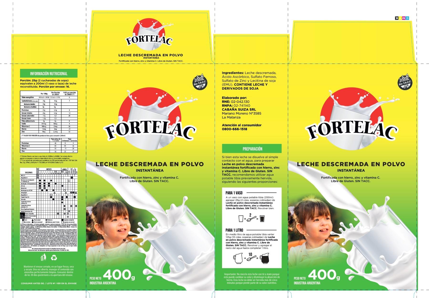 Descripción: LECHE DESCREMADA EN POLVO INSTANTÁNEA FORTIFICADA CON HIERRO, ZINC Y VITAMINA C. LIBRE DE GLUTEN. SIN TACC FORTELAC 400,00 GRAMOS (GR)
