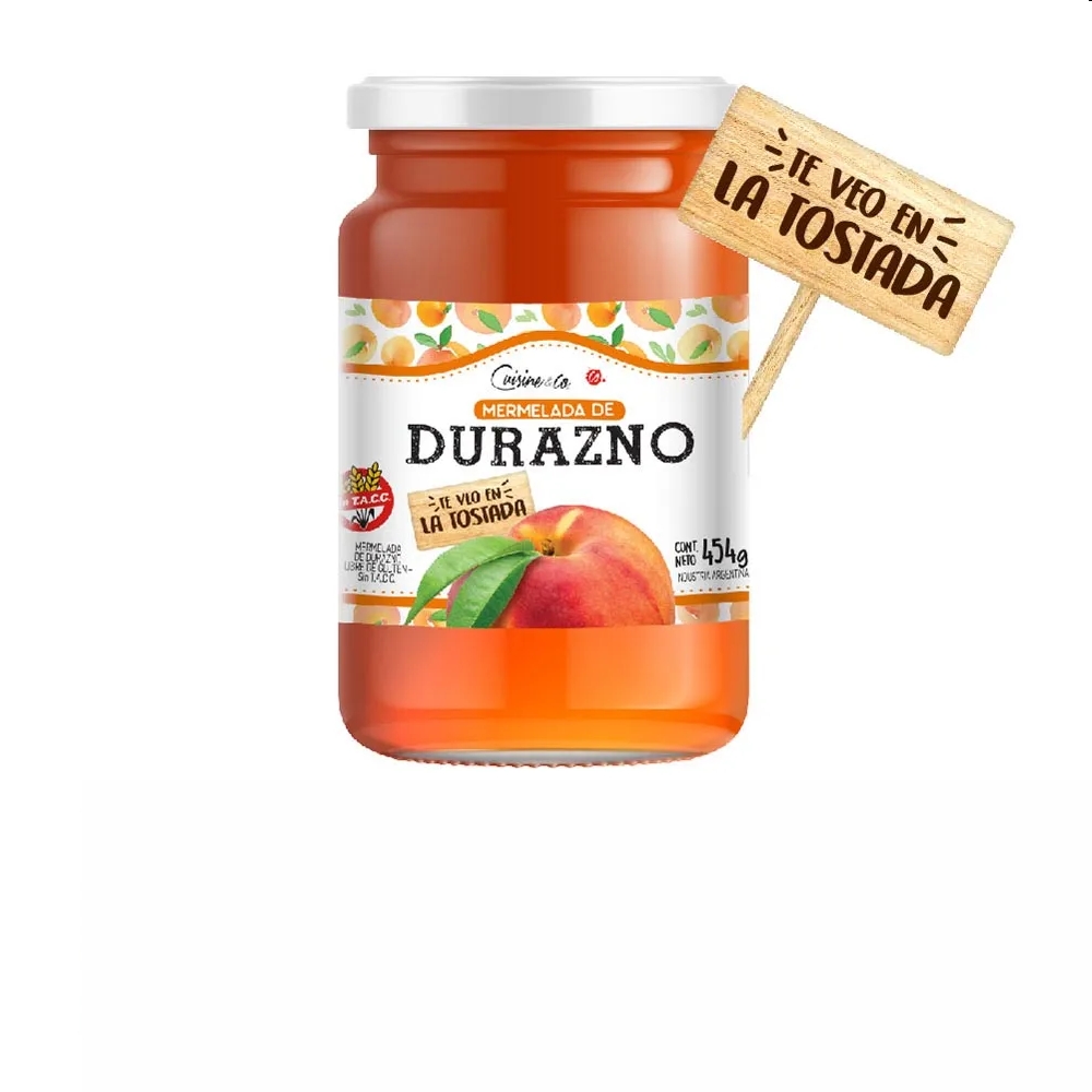 Pulpa de duraznos, azúcar, jarabe de glucosa, gelificante pectina, acidulante ácido cítrico, conservador sorbato de potasio, aromatizante artificial, antiespumante ins 900